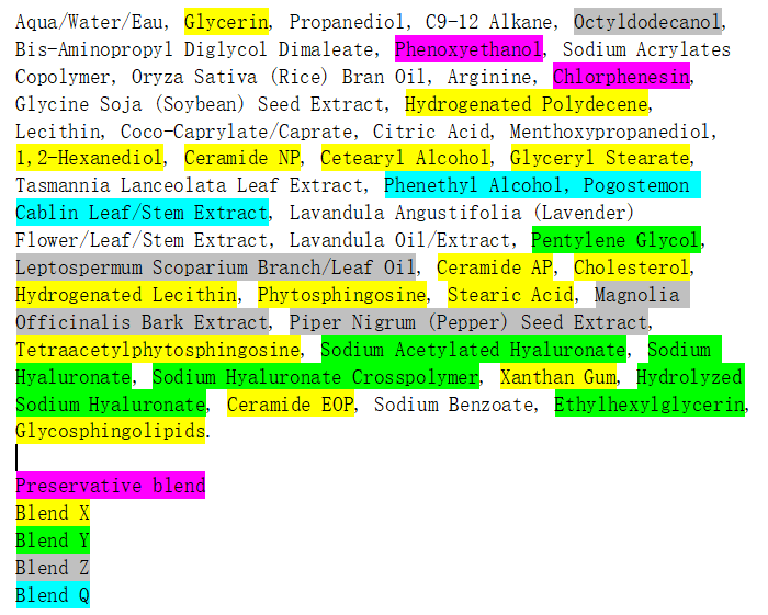 The presence of two preservative blends is probably because one comes premixed within the ceramide complex. In summary, the formulation can be viewed as a set of functional blocks (based on my best interpretation):