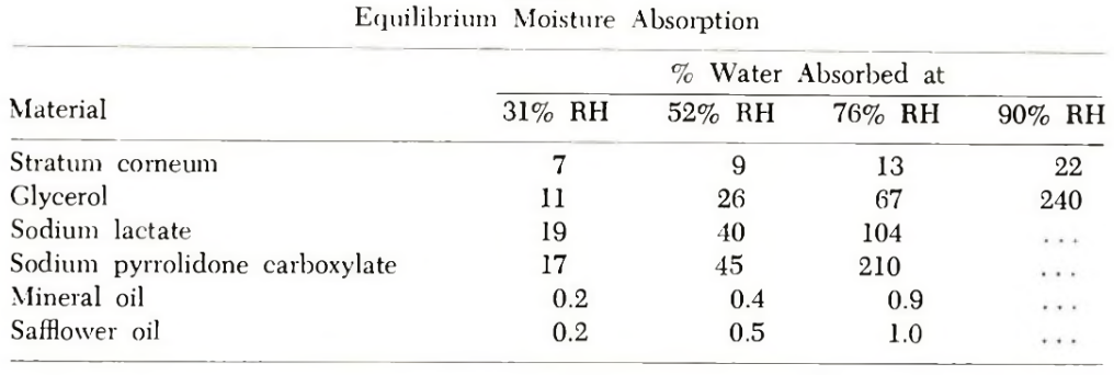 Glycerin is highly effective at drawing moisture from the air, making it an excellent and versatile moisturizing agent. Its hygroscopic nature becomes especially pronounced at high relative humidity (RH) levels. The table below compares the moisture absorption properties of various materials.